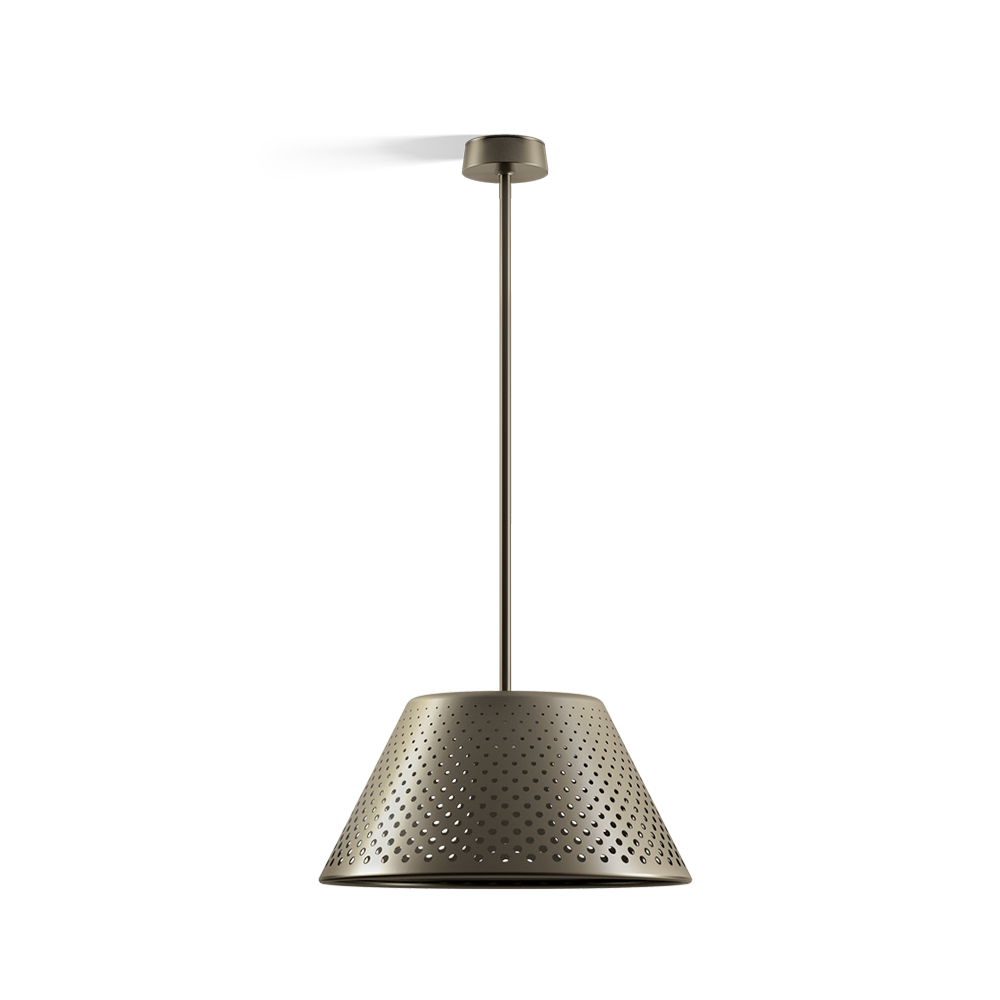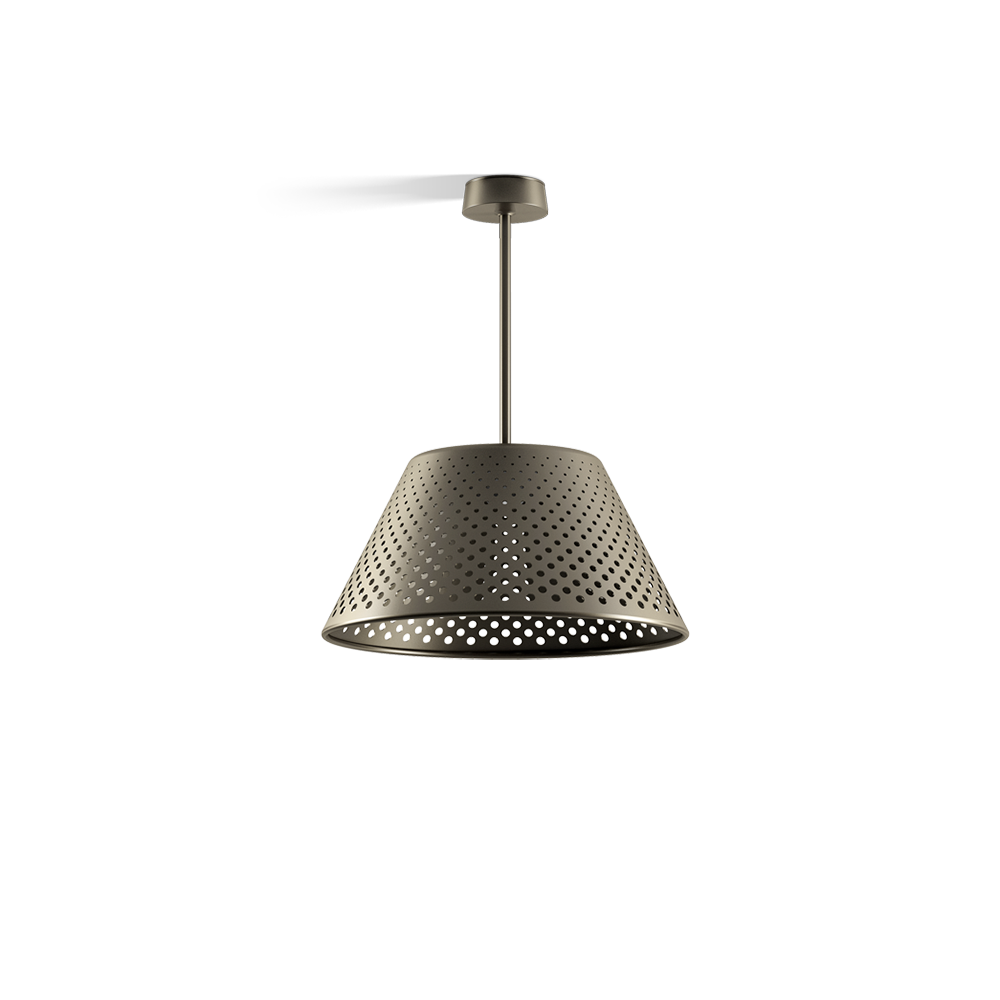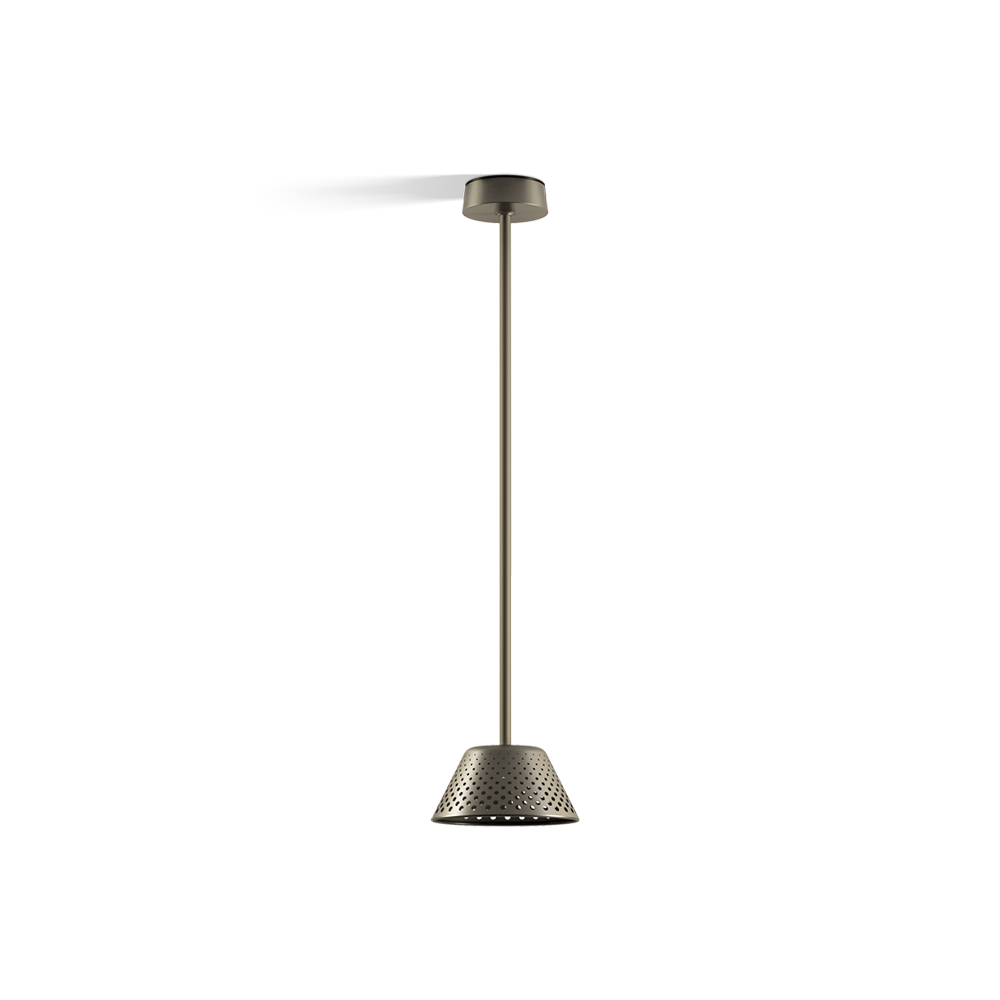 Aluminium alloy ceiling connector . Head manufactured from milled steel and base in die-cast aluminium EN 44300 with very low copper content. Rod made of stainless steel. Polycarbonate opal diffuser screen. No visible screws. Subjected to galvanic anodizing treatment divided into distinct phases: mechanical satin finishing, surface degreasing, anodic oxidation and final sealing. The product is painted following a continuous two step paint process (epoxy-based primer + polyester- based colour finish), which allows to generate a single thick protective coating which then generates aprotective barrier against atmospheric agents and UV rays.