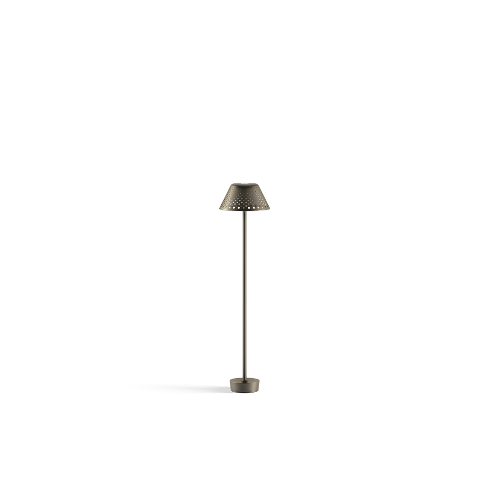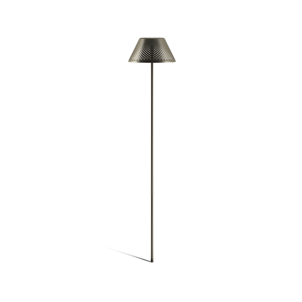 Aluminium alloy base and ground attachment. Head manufactured from milled steel and base in die-cast aluminium EN 44300 with very low copper content. Rod made of stainless steel. Polycarbonate opal diffuser screen. No visible screws. Subjected to galvanic anodizing treatment divided into distinct phases: mechanical satin finishing, surface degreasing, anodic oxidation and final sealing. The product is painted following a continuous two step paint process (epoxy-based primer + polyesterbased colour finish), which allows to generate a single thick protective coating which then generates aprotective barrier against atmospheric agents and UV rays.